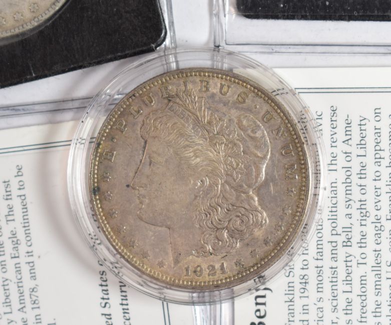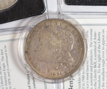 Three American coins comprising 1880 and 1921 Morgan Dollars and a 1948 Liberty half Dollar