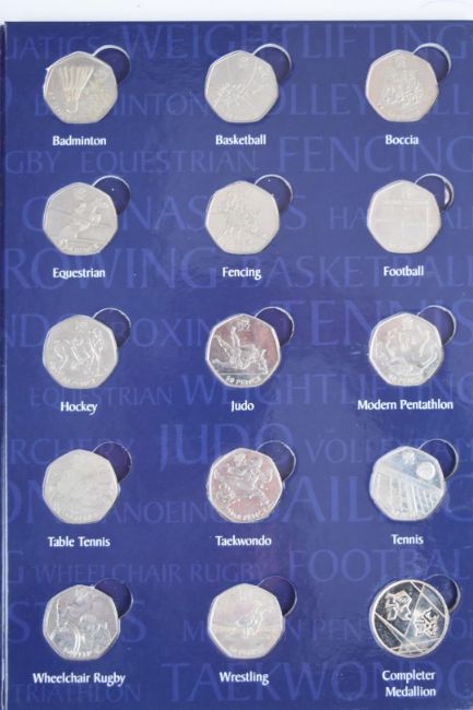 The Lighthouse 50p sports album containing twenty nine Olympic 2011 50p coins, plus the Complete Medallion