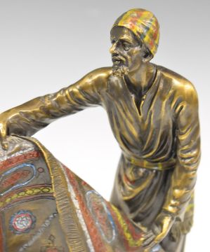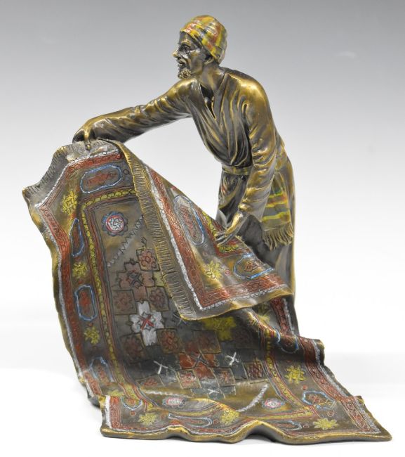 Cold painted bronze figure of an Arab / Eastern carpet seller with impressed Bergman and with foundry mark verso, height 20cm