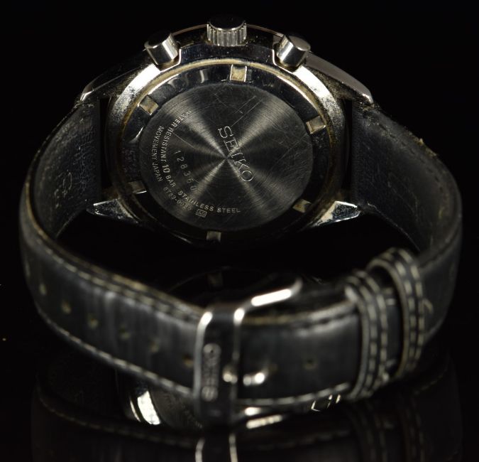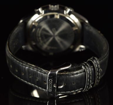 Seiko gentleman's chronograph wristwatch ref. 6T63-00B0 with date aperture, luminous steel hour and minutes hands, red centre seconds hand, back dial, stainless steel case and quartz movement, on black leather strap, case diameter 40mm, serial number 128360.