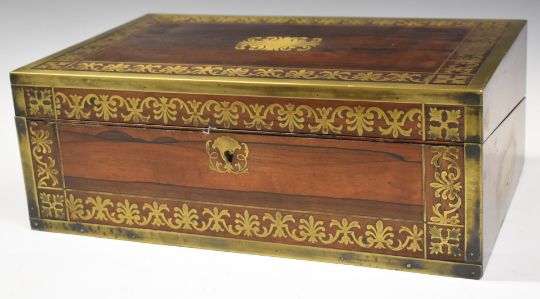Rosewood brass bound writing slope with campaign style handles, length 41cm