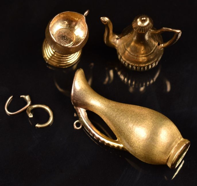 Three 9ct gold charms including jug, coffee pot and goblet, 4.5g