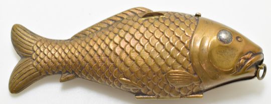 19thC gilt metal and glass fox head scent bottle with floral gilt decoration, in brass fish case with lined interior, scent bottle 7.5cm, case 10cm