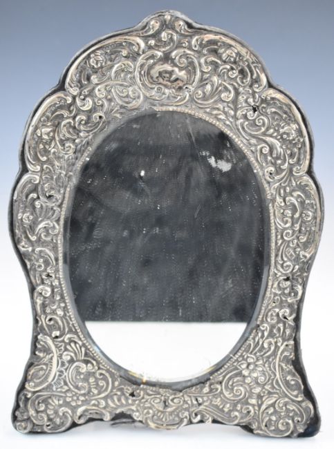 Edward VII or George V hallmarked silver dressing table mirror with oval bevelled glass and easel back, marks indistinct but likely Birmingham 1910, maker Henry Matthews, height 32cm