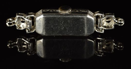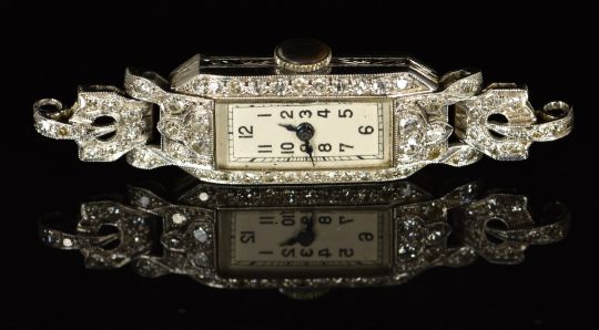 Art Deco diamond set platinum ladies wristwatch with blued hands, black Arabic numerals, silver dial, and mechanical movement, 48x11mm.