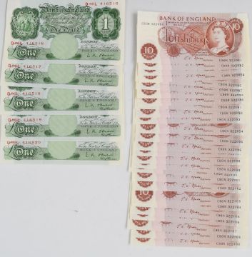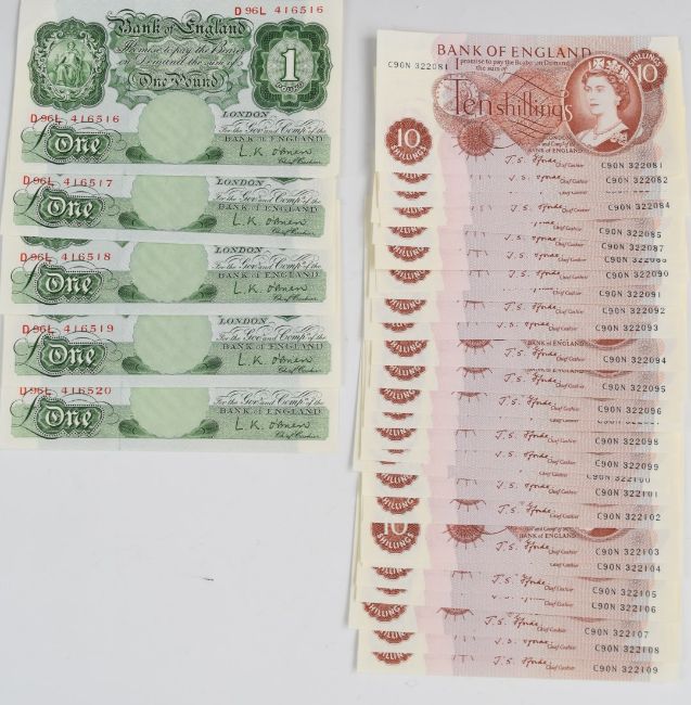 Five consecutive £1 O’Brien uncirculated 1955 'L Series' banknotes, serial numbers D96L 416516-20 and twenty nine consecutive 10 shillings Fforde uncirculated 1968 '2nd issue' examples, serial number C90N 322081-109