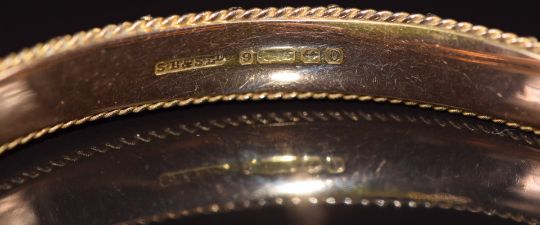 A 9ct gold bangle with engraved, rope twist and sphere decoration, Birmingham 1913, 8.7g