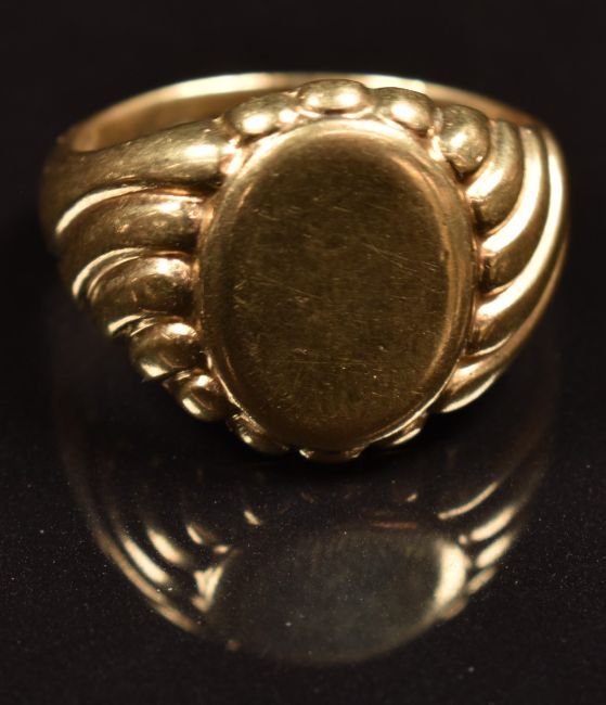 A 9ct gold signet ring with ridged shoulder decoration, 8.9g, size M