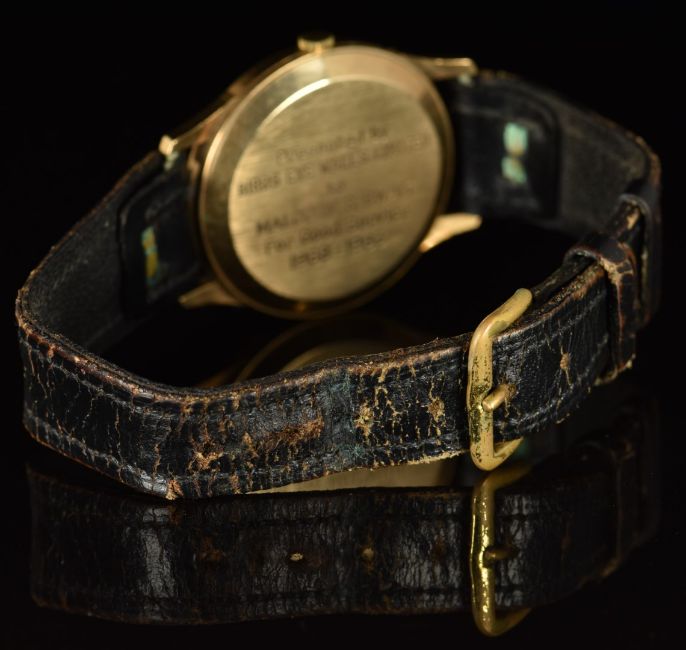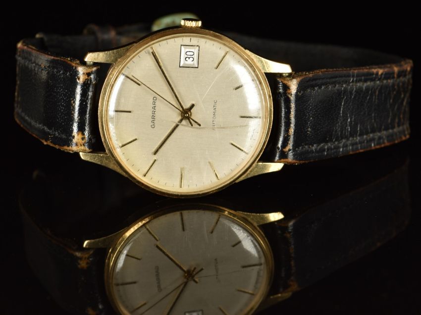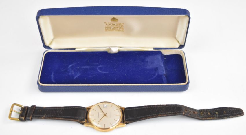 Garrard 9ct gold gentleman's automatic wristwatch with date aperture, two tone hands and baton hour markers, silver dial and mechanical movement, on black leather strap, case diameter 33mm, in original box.