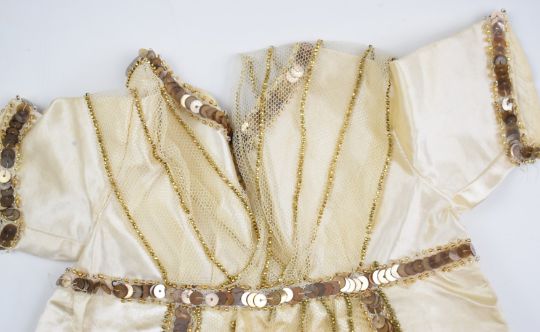 19thC cream silk and lace child's dress with sequinned and beaded decoration and lace trim to the hem, length 52cm