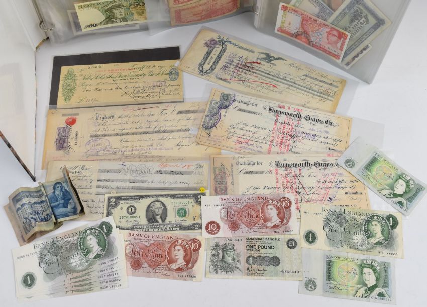 Collection of all world banknotes including uncirculated examples, five consecutive £1 notes, vintage cheques etc