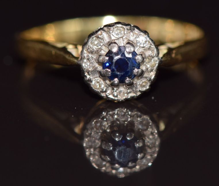 An 18ct gold ring set with a sapphire surrounded by diamonds, 3g, size O