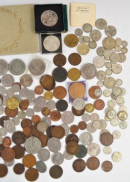 A collection of UK coinage George II onwards, includes modern crowns, coin pack for 1976 and approximately 205g of mixed silver