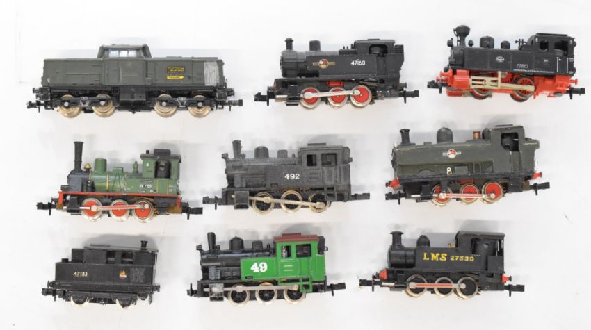 Nine Hornby Minitrix and other N gauge model railway locomotives including Continental and Sentinel Shunting.