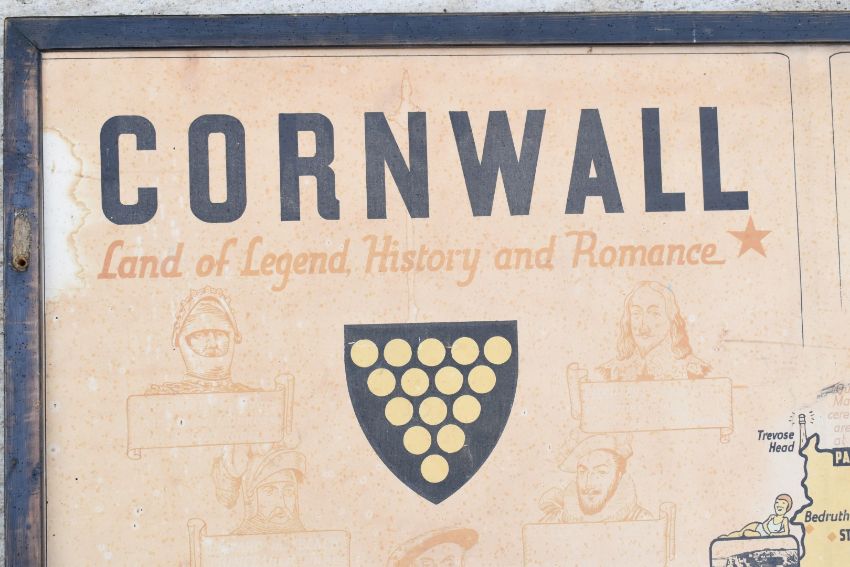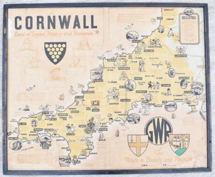 GWR Cornwall The Route to Beauty and Pleasure advertising sign or poster depicting a map of the county showing potential destinations, 90 x 110cm, in wooden frame, marked verso GWR