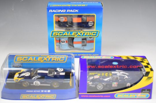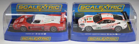 Eight Scalextric model slot racing cars comprising six individual and one twin car set. Models include Maserati MC12, Aston Marin DBR9 and Ford GT40, most in original boxes.