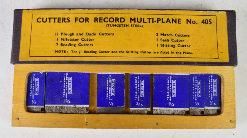 Record 405 woodworking multi-plane, in original wooden box with cutters and instructions