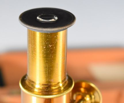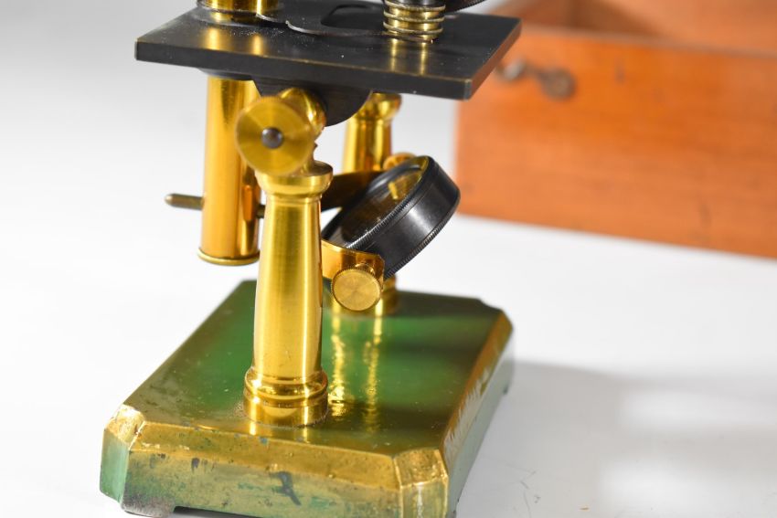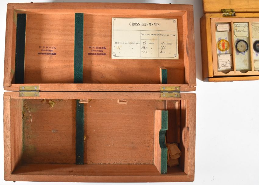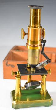 Wooden cased brass microscope, height 26cm, together with a case of thirteen microscope slides including beetle, fossil etc