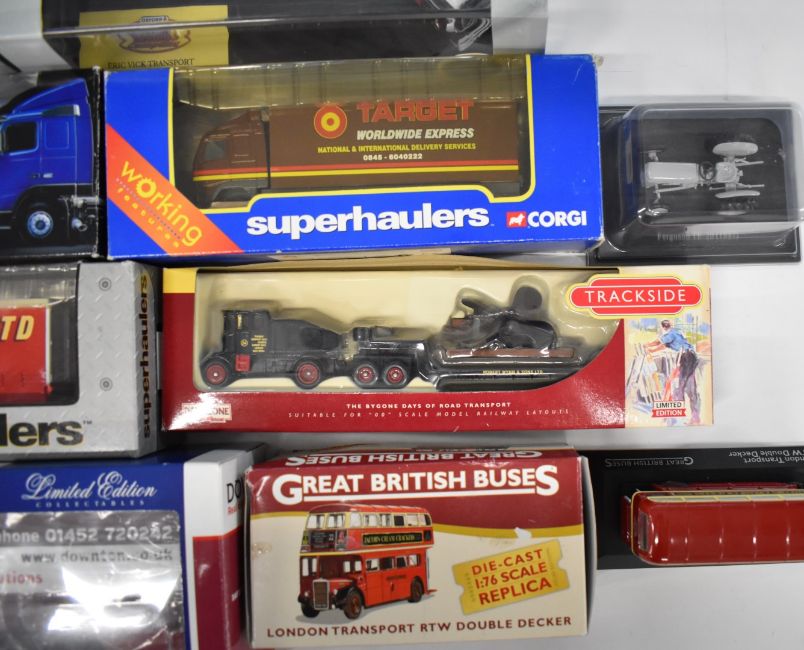 A collection of diecast model lorries and buses to include Oxford Haulage, Corgi, Lledo and Atlas, all in original boxes.