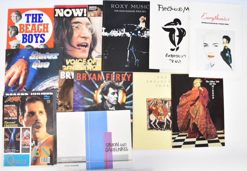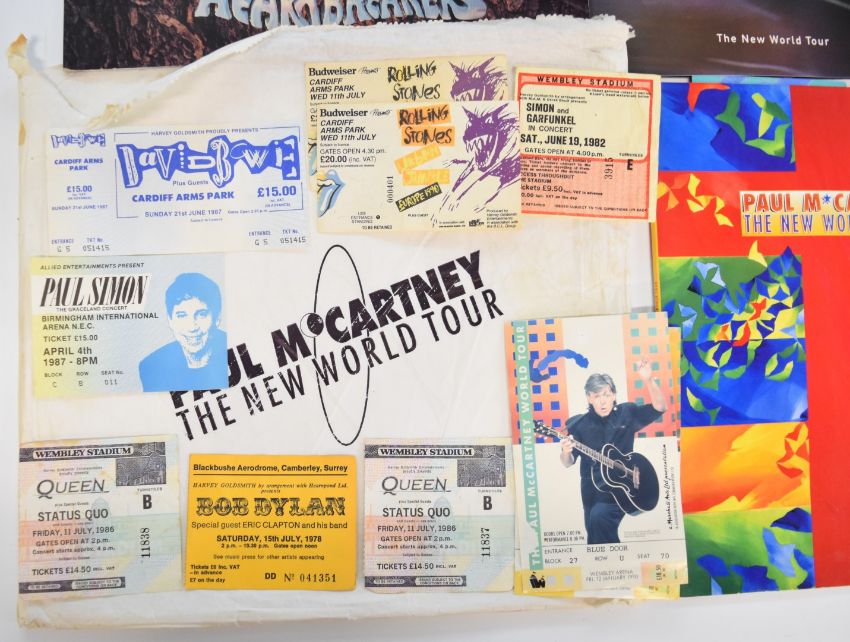 Collection of pop / rock programmes and ticket stubs, programmes to include pre Glastonbury 'Bath Festival of Blues and Progressive Music' featuring Pink Floyd, Byrds, Frank Zappa, Moody Blues, Led Zeppelin, Canned Heat, Jefferson Airplane, etc; Bob Dylan with Eric Clapton and Joan Armatrading, Queen, Roxy Music / Brian Ferry, Fleetwood Mac, Paul McCartney, David Bowie etc, ticket stubs include Bob Dylan 1978, David Bowie, Queen, Rolling Stones, Simon and Garfunkel etc, together with two unworn Bob Dylan t-shirts