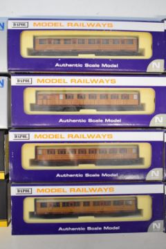 Twelve Dapol and Graham Farish LNER N gauge model railway teak coaches, all in original boxes.
