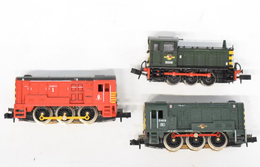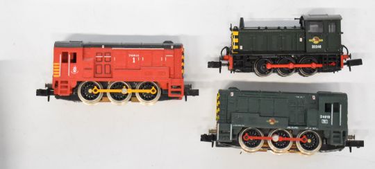 Three Graham Farish N gauge model railway diesel locomotives Class 04 and two Class 08, all in original boxes.