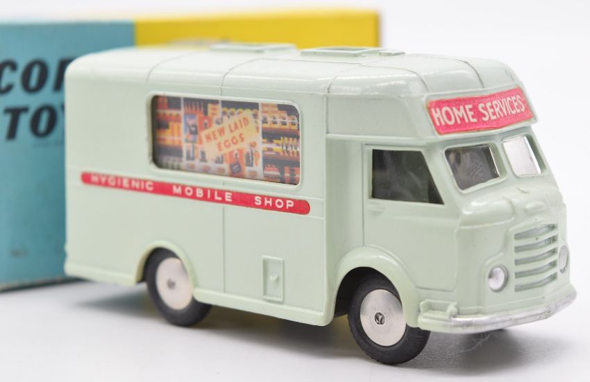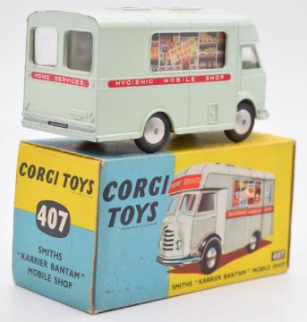 Corgi Toys diecast model Smiths 'Karrier Bantam' Mobile Shop with pale blue body, flat hubs and 'Hygienic Mobile Shop Home Services' decals, 407, in original box.