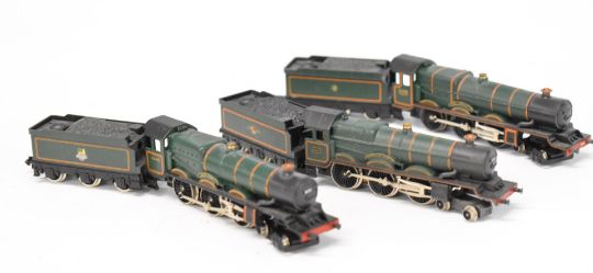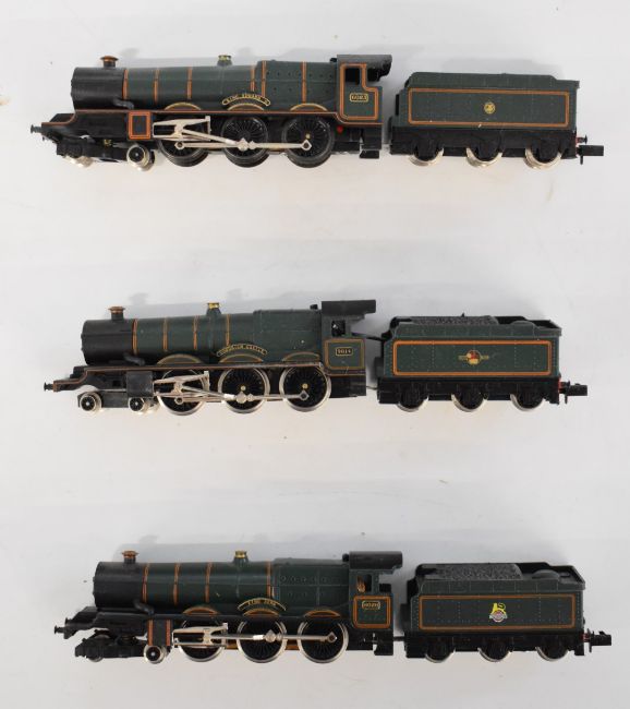 Three Graham Farish N gauge model railway locomotives comprising BR King John, Goodrich Castle and GWR King Edward II, all original boxes.