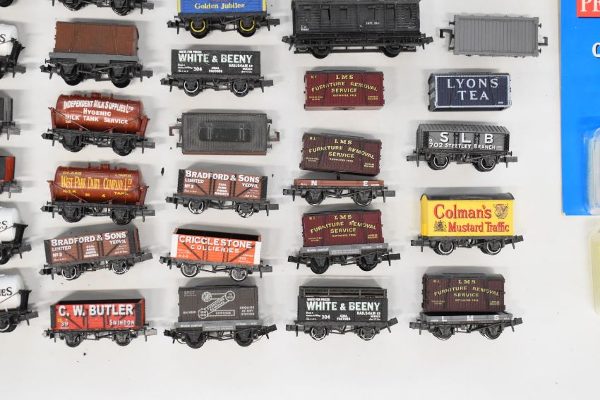 Sixty-eight Peco N gauge model railway wagons including conflat and tanker, some in original boxes.