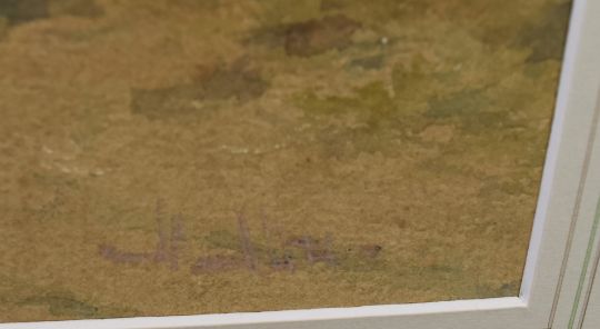 Early 20thC watercolour landscape with lady and child looking out from behind a tree, 48 x 66cm