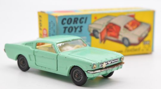 Corgi Toys diecast model Ford Mustang Fastback 2+2 with mint green body, cream interior and corgi on parcel shelf, 320, in original box.