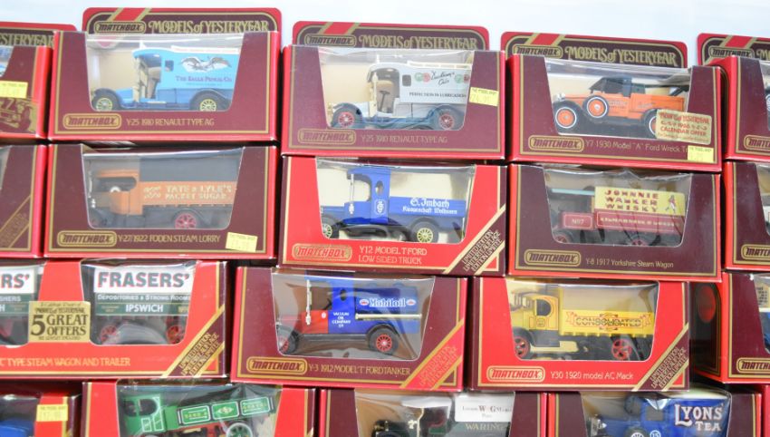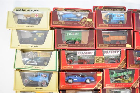 Fifty Matchbox Models of Yesteryear diecast model cars, delivery trucks etc, all in original boxes.