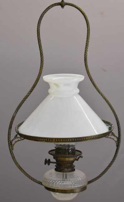 Victorian hanging oil lamp with Hinks No2 burner, H43cm