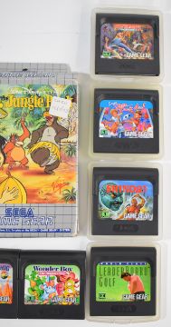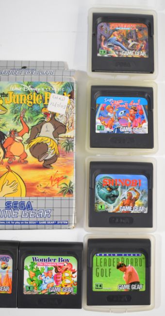 Eleven Sega Game Gear game cartridges to include Shinobi, Wonder Boy, Streets of Rage and Jurassic Park.