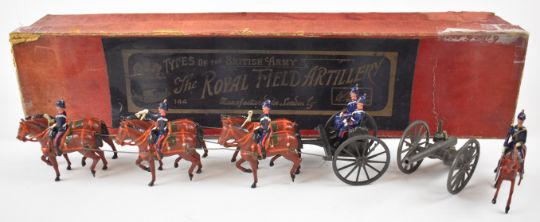 Britains Royal Field Artillery comprising 3 pairs of horses with 3 riders, 2 seated drivers on carriage, cannon and single horse with rider, 144, in original black label box.