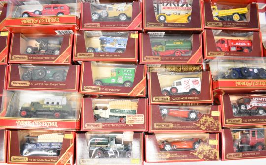 Over Fifty Matchbox Models of Yesteryear diecast model cars including buses, trams, truck and steam powered engines, all in original boxes.