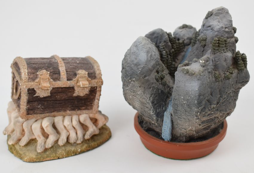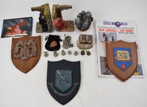 A collection of Terry Pratchett Discworld ephemera including Clarecraft figurines, coats of arms, newsletters and other collectibles. Some of these items where purchased by the vendor at the first UK Discworld convention in 1996 and were exclusive to that event.