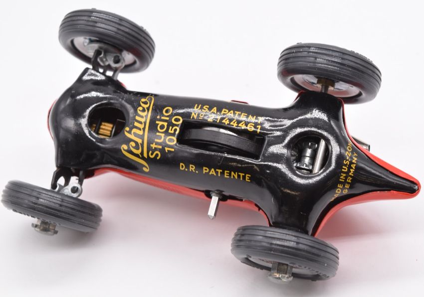 Schuco Studio 1050 clockwork tinplate racing car with red body, brown interior and silver hubs.