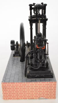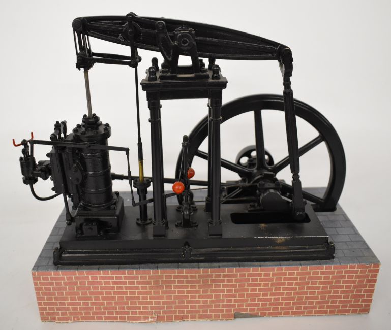 Live steam model beam engine, with dummy flyball governor, single double acting cylinder and spoked flywheel, on faux brick base, length of base 36cm