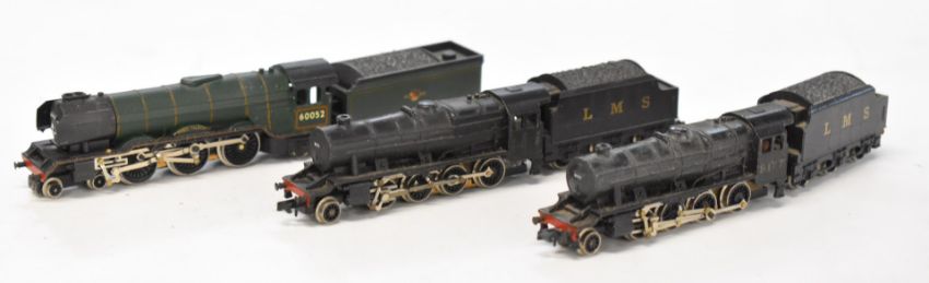 Three Graham Farish N gauge model railway locomotives 60052 and two LMS 2-8-0.