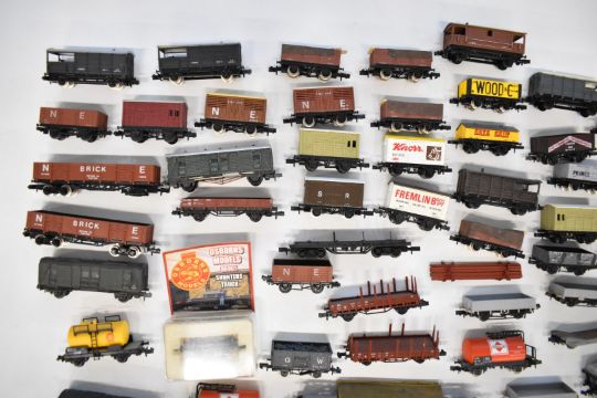 Ninety Graham Farish, Lima, Osborns and similar N gauge model railway wagons, some in original boxes.