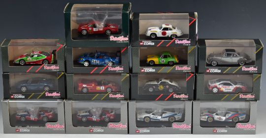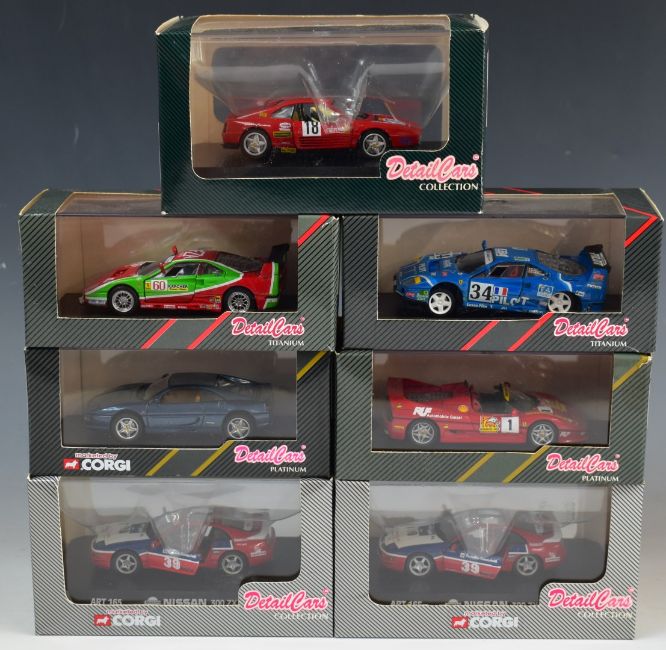 Thirteen Detail Cars 1:43 scale Platinum and Titanium Series diecast model cars including Ferrari F40 1995 Racing, Ferrari F355 1995 Coupé and M.G. Midget MK IV 1969 Racing, all in original display boxes.