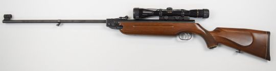 Weihrauch HW35 .22 air rifle with chequered semi-pistol grip, raised cheek piece, sling mounts, adjustable trigger and sights and Nikko Stirling Gold Crown 4x40 scope, serial number 884349.