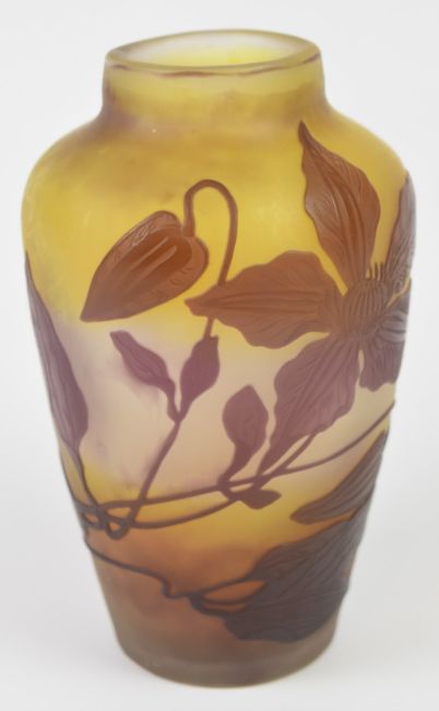 Emile Gallé cameo glass vase with purple decoration of flowers and foliage over a yellow and clear ground, 15cm tall.