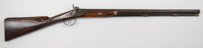 Henham boys or ladies percussion hammer action sporting gun with named and engraved lock, engraved slylised dolphin hammer, top plate, trigger guard butt plate and mounts, chequered grip, brass tipped wooden ram-rod, bird's eye maple stock and 23.5 inch smooth bored Damascus barrel, overall length 97cm.
