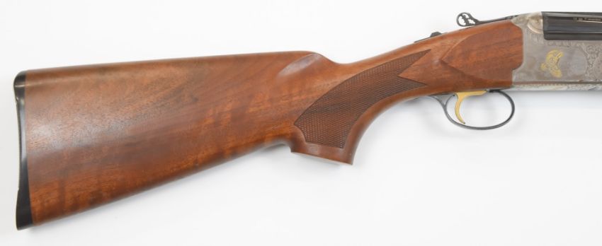 Bettinsoli Diamond 12 bore over and under ejector shotgun with gold inlaid birds to the lock and underside, engraved locks, underside, trigger guard, top plate, thumb lever and mounts, chequered semi-pistol grip and forend, single gilt trigger vented top and central ribs and 30 inch multi-choke barrels, overall length 120cm, length of pull 36.5cm, serial number 182644, in original fitted case with two additional chokes.  PLEASE NOTE THAT A VALID RELEVANT FIREARMS/SHOTGUN CERTIFICATE IS REQUIRED TO HANDLE/PURCHASE THIS ITEM.