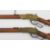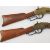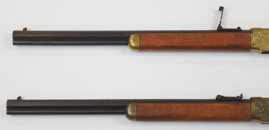 A pair of Winchester style lever action replica rifles, each with huntsmen, deer and dogs embossed to the action and wooden stock, 99cm long.