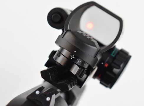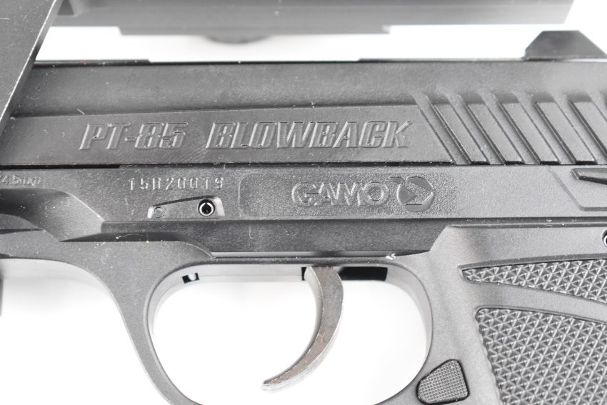 Gamo PT-85 Blowback .177 COair pistol with chequered composite grip and red/ green dot and red laser sights, serial number 15D20019, in original box.