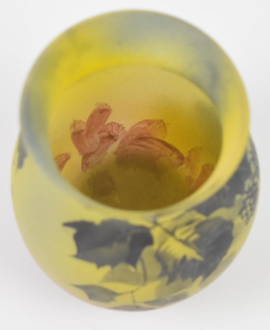 Jean-Simon Peynaud Art Nouveau glass vase with painted decoration of berries and foliage, 8cm tall.