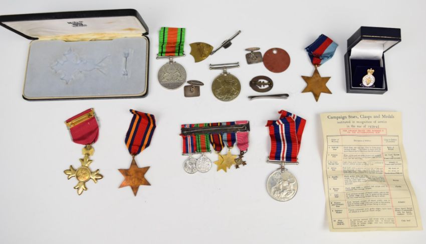 WW2 medal group of five attributed to W Scott, comprising OBE (Civil Award), 1939/1945 Star, Burma Star, Defence Medal and War Medal, Veteran's badge, postal box etc